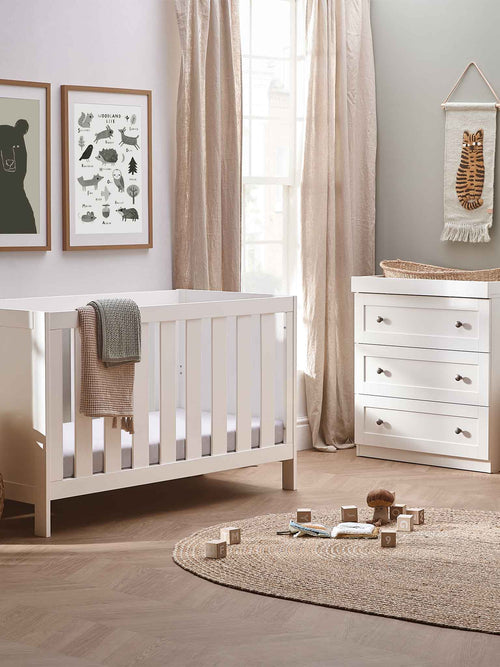 Start with the essentials – your furniture. If you don’t have room for a full 3-piece nursery furniture set, then a cot bed and dresser with changing table are the perfect starting point. Discover our range of 2-piece sets here, which have been thoughtfully designed with space-saving solutions and smaller rooms in mind.