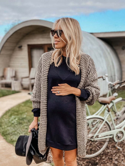 Another oversized item that became a main feature in my wardrobe was the longer length cardigan. Worn done up over the bump or loose as a layer, it worked with my changing shape and is a key piece for post-partum nursing too.
