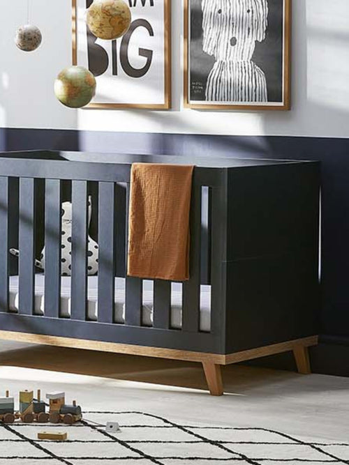 The deep, dark blue finish is complemented by warm oak details for a standout look. Cleverly designed with smart storage solutions, the St Ives nursery set will grow with your child from birth to toddler.